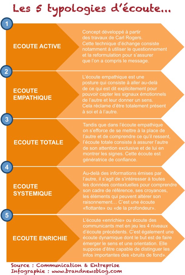 Et pour vous donner un meilleur aperçu de cet ouvrage, sans trop vous en dévoiler néanmoins les contenus car je vous recommande évidemment de vous le procurer, je me suis permis d’ajouter ici et là quelques-unes de ces infographies dont j’ai le secret, résumant notamment les « 7 facteurs clés de succès d’une bonne écoute » ainsi que les « 6 typologies d’écoute et leur(s) usage(s) ».