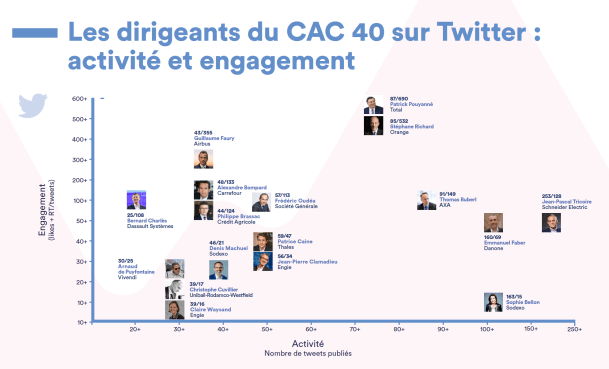 On ne se limite pas au CAC 40 ou au SBF 120, on cherche à avoir la photo la plus exhaustive possible. Ensuite, l’étude se donne comme objectif de mesurer leur performance. Nous le faisons en combinant des critères d’audience (nombre d’abonnés bien sûr, mais aussi profils de ces abonnés), d’activité (on élimine ceux qui ne publient pas ou presque), d’engagement (est-ce que les posts génèrent de l’engagement), sur Twitter et Linkedin ; et un dernier critère observe le trafic de leur page Wikipédia, ce qui donne un indice de leur célébrité, de l’intérêt qu’on leur porte, de leur présence médiatique.