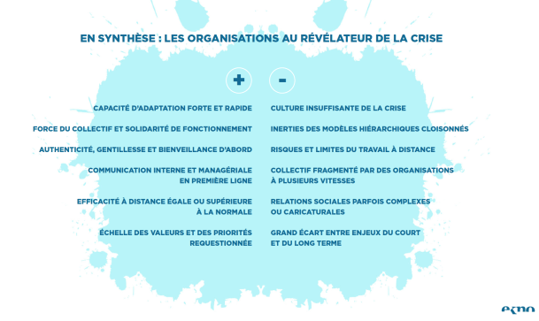 The BrandNewsBlog : Première leçon des semaines écoulées, il semble que les enseignements positifs identifiés par les entreprises et leurs dirigeants soient presque aussi nombreux que les failles détectées… et fonctionnent souvent comme l’endroit et l’envers d’une même médaille. Vous avez eu raison à cet égard de les regrouper par couples opposés (> voir le schéma de synthèse ci-dessous) : 1) Formidable agilité et capacité d’adaptation des entreprises sous la contrainte versus Manque d’anticipation et culture insuffisante de la crise et de la gestion des risques ; 2) Force du collectif, mobilisation des collaborateurs et solidarité accrue (toujours sous la contrainte) versus Inadaptation des modèles organisationnels en place, trop hiérarchiques et cloisonnés ; 3) Relations plus proches, authentiques et bienveillantes (entre collègues et vis-à-vis des managers) et revitalisation du management et de la com’ interne versus Limites du travail à distance et exacerbation de certains rapports de force… Pouvez-vous nous présenter les couples les plus marquants et ce que vous en retenez ?