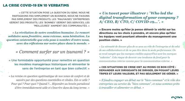 Comme tu l’évoques, c’est d’abord au niveau des dirigeants que l’impulsion et la conviction devront être fortes et résolues. La franchise, la lucidité et la profondeur avec lesquelles la plupart d’entre eux nous ont répondu – on le ressent dans le choix et l’authenticité de leurs mots – laissent peu de doutes sur ce point. Leur envie est là, et d’autant plus présente que leurs équipes ont montré qu’elles étaient au rendez-vous, y compris dans l’urgence et totalement à distance.