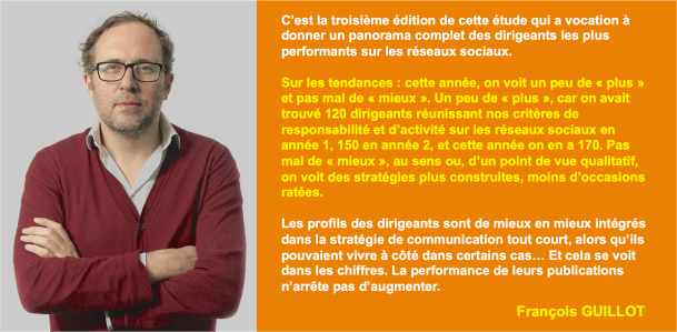 François Guillot : Bonjour Hervé. Effectivement, c’est la troisième édition de cette étude qui a vocation à donner un panorama complet des dirigeants les plus performants sur les réseaux sociaux. Quand on a commencé il y a trois ans, on voyait bien que, depuis quelques années maintenant, de plus en plus de grands patrons d’entreprises étaient actifs sur Twitter et sur Linkedin, et d’ailleurs nos clients nous demandaient de plus en plus de les aider à accompagner leurs dirigeants dans ce qui reste une forme récente de communication. Cette tendance, tout le monde la ressentait mais nous avons identifié le besoin de mesurer l’ampleur du phénomène. Un des objectifs que se donne cette étude est donc d’identifier tous les dirigeants (CEO ou Président) de grandes entreprises françaises présents sur les réseaux sociaux.