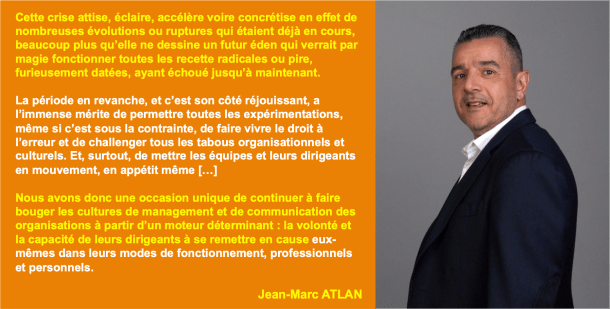 Jean-Marc Atlan : Il s’agit d’une confirmation pour certains, peut-être d’une prise de conscience pour d’autres. Les nouveaux modes de travail dans les entreprises pousseront inévitablement le rôle du manager à évoluer, car la situation actuelle ne fait finalement qu’accréditer et accélérer l’urgence de cette nécessaire transformation. Parce que la crise et le confinement en ont souligné à la fois tout l’intérêt et toute la puissance.