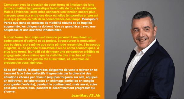 Jean-Marc Atlan : Composer avec la pression du court terme et l’horizon du long terme constitue la gymnastique habituelle de tous les dirigeants. Mais à l’évidence, cette crise consacre une tension encore plus marquée pour eux entre ces deux échelles temporelles en posant plus que jamais ce défi de la concordance des temps. Pourquoi ? Parce que dans ce contexte de visibilité réduite et de fragilité augmentée, les dirigeants doivent faire ce grand écart avec une souplesse et une dextérité inhabituelles. Ils ont en effet face à eux des publics internes et externes qui attendent autant des modalités d’organisation ou de reconnaissance précises pour la semaine à venir, que des projections et de la réassurance pour les années futures dans un contexte économique fragilisé.