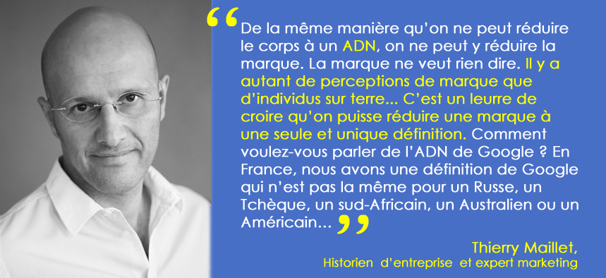 « De la même manière qu’on ne peut réduire le corps à un ADN, on ne peut y réduire la marque. La marque ne veut rien dire. Il y a autant de perceptions de marque que d’individus sur terre. C’est un leurre de croire qu’on puisse réduire une marque à une seule et unique définition. Comment voulez-vous parler de l’ADN de Google ? En France, nous avons une définition de Google qui n’est pas la même pour un Russe, un Tchèque, un Sud-Africain, un Australien ou un Américain ».