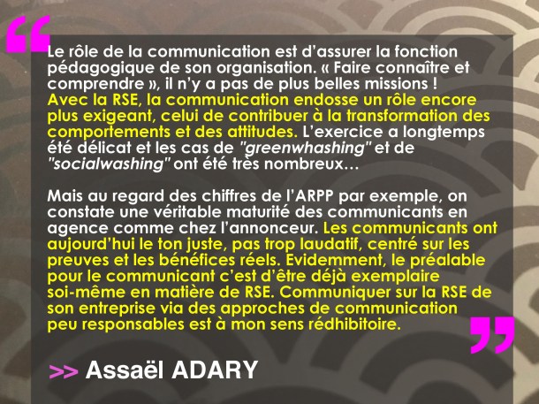 Assaël Adary : La communication responsable n’est pas un concept nouveau, j’avais déjà introduit cette notion dans le Communicator 8 et je milite pour ce sujet depuis 2010, notamment au sein de Com-Ent via l’application de la norme ISO 26000 aux métiers de la communication.