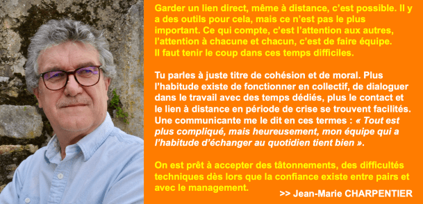 Jean-Marie Charpentier : C’est certain, l’expérience de la pandémie de Covid-19 a été refondatrice pour de nombreux communicant.e.s internes. Ils nous l’ont dit. Il a fallu tenir le cap dans un moment critique et ils ont su se montrer particulièrement utiles grâce aux relations entretenues avec les dirigeants, les managers et les salariés, pour assurer une continuité de service. Leur pouvoir d’agir, émanant de leur bonne connaissance du terrain, s’est trouvé accru dans les cellules de crise, dans le contact avec les managers et leurs équipes.