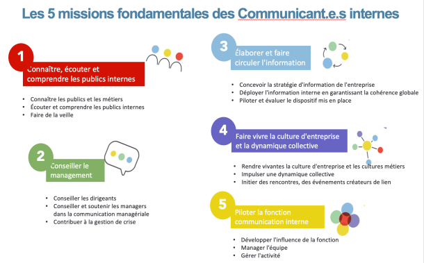 Fabienne Ravassard : Oui, dans cette optique, on est partis assez vite sur l’idée de constituer un groupe de travail et nous avons rapidement pu composer un groupe dynamique et représentatif de professionnelles issues d’entreprises et d’institutions de taille et de secteurs très différents, aux niveaux d’ancienneté variés. Nous les avons rassemblées lors d’une première journée d’atelier, en repartant d’emblée de la base existante de 2004, et en les faisant réagir et échanger en modalités d’intelligence collective sur les principales missions des communicants internes. Cela a permis de déboucher assez rapidement sur 5 grandes missions essentielles, auxquelles le groupe de travail a rattaché à chaque fois 3 ou 4 activités. Soit au final 5 missions et 16 grandes activités principales qui ont pu être définies et auxquelles nous avons associé progressivement les savoir-faire correspondants.