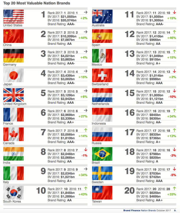 Ainsi, tandis que le « Anholt-GfK Nation Brands Index » voit la marque France progresser du 5ème rang au deuxième rang mondial entre 2016 et 2017 (alors que les Etats-Unis chutent de la première à la sixième place), le classement 2017 des 100 marques nationales les plus puissantes publié par l’agence d’évaluation Brand Finance voit quant à lui la valeur de la marque France faire un bond de 27%, de 2 339 milliards de dollars à 2 969 milliards, en restant au 6ème rang des marques pays ayant la plus forte valorisation.