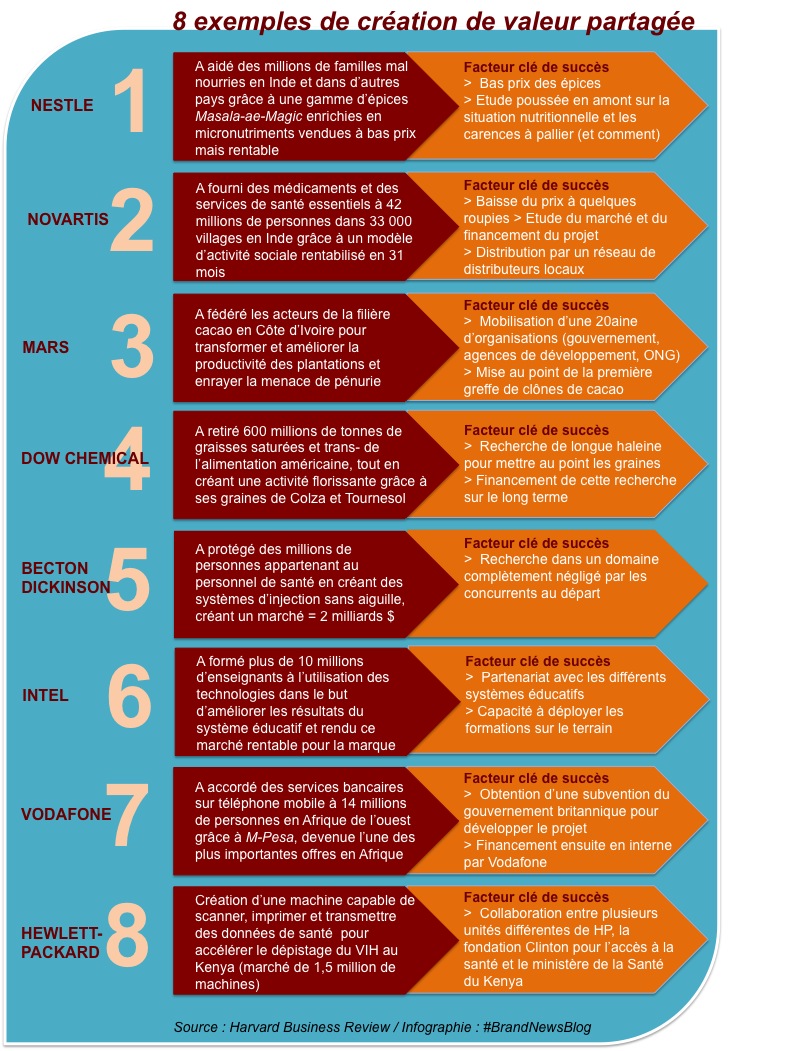 Et au sein de l’entreprise, ce type de démarche est particulièrement porteur pour 4 raisons principales : 1) cette innovation est pourvoyeuse de nouveaux débouchés rentables ; 2) elle permet à l’entreprise de se doter (ou de renforcer) une mission sociale supérieure 3) cette mission est un facteur de cohésion d’autant plus fort que les valeurs et actions sont réellement incarnées par les dirigeants et appropriées par les collaborateurs 4) La création de valeur partagée renforce les marques corporate, commerciale et employeur auprès de leurs publics.
