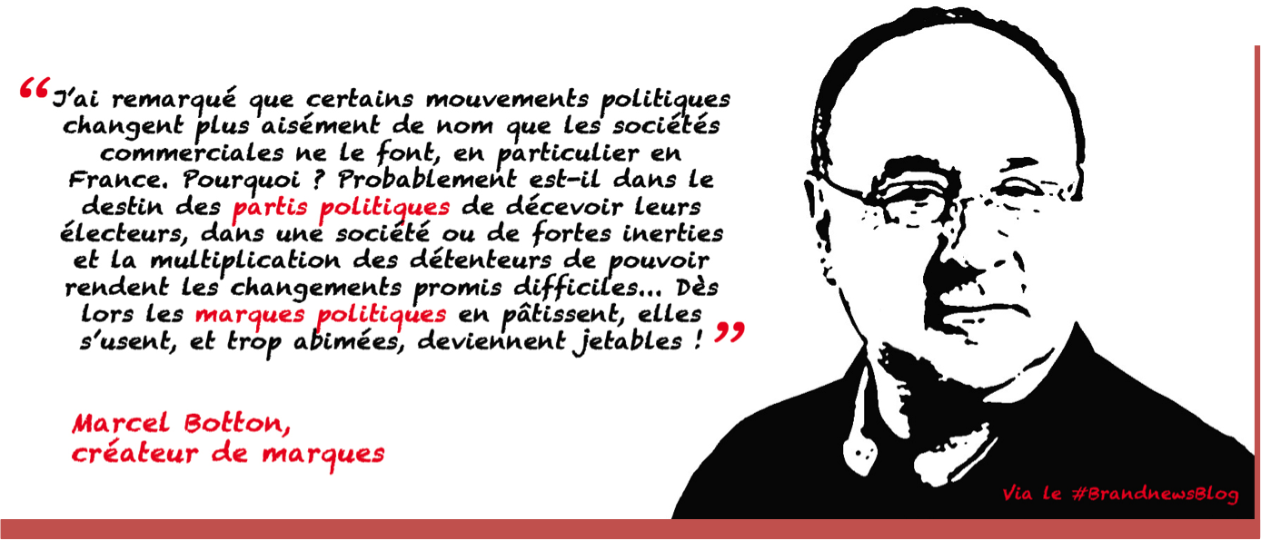 Marcel Botton : J’ai remarqué que certains mouvements politiques changent plus aisément de nom que les sociétés commerciales ne le font, en particulier en France. Pourquoi ? Probablement est-il dans le destin des partis politiques de décevoir leurs électeurs, dans une société ou de fortes inerties et la multiplication des détenteurs de pouvoir rendent les changements promis difficiles… Dès lors les marques politiques en pâtissent, elles s’usent, et trop abimées, deviennent jetables !
