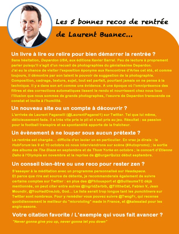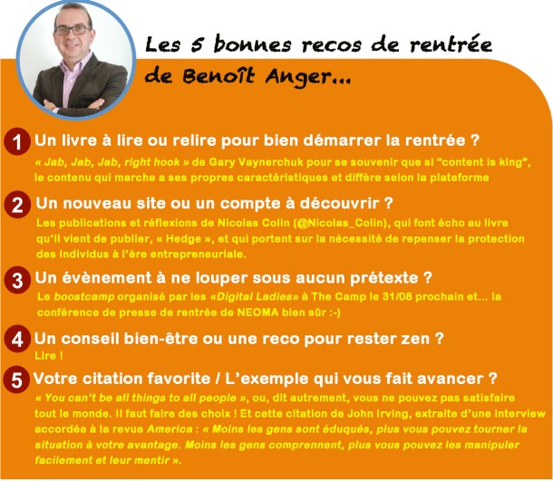 Comme mes « invités de marque » de la semaine passée, chacun.e a bien voulu partager avec nous la liste de ses « 5 bonnes recommandations de rentrée », après avoir répondu aux questions que je lui avais posées. J’ai repris ci-dessous le résultat de ces suggestions qui, à n’en pas douter, viendront alimenter vos listes de lecture, votre réflexion et/ou vos agendas :-)