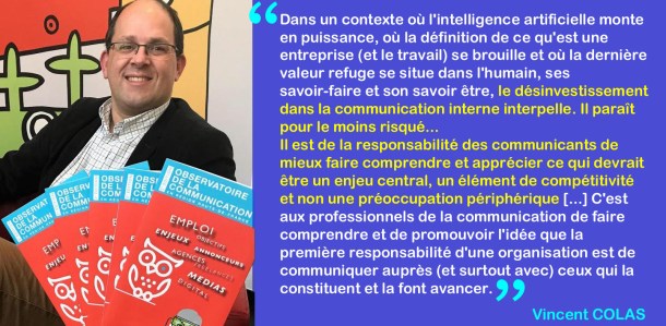 A cet égard, outre le faible degré de priorité relevé pour les sujets et enjeux de communication interne dans le cadre de son Observatoire de la communication 2018, l’association Place de la communication pointe aussi une baisse des investissements consacrés à tous les supports internes, qu’ils soient traditionnels ou numériques, par rapport à son édition 2016… Et s’interroge : « Dans un contexte où l’intelligence artificielle monte en puissance, où la définition de ce qu’est une entreprise (et le travail) se brouille et où la dernière valeur refuge se situe dans l’humain, ses savoir-faire et son savoir être, le désinvestissement dans la communication interne interpelle. Il paraît pour le moins risqué ».
