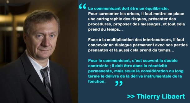 Thierry Libaert : Le communicant doit être un équilibriste. Pour surmonter les crises, il faut mettre en place une cartographie des risques, présenter des procédures, proposer des messages, et tout cela prend du temps. Face à la multiplication des interlocuteurs, il faut concevoir un dialogue permanent avec nos parties prenantes et là aussi cela prend du temps. Pour le communicant, c’est souvent la double contrainte ; il doit être dans la réactivité permanente, mais seule la considération du long terme le délivre de la dérive instrumentale de la fonction.